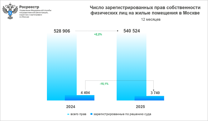 За январь — декабрь минувшего года специалисты Управления Росреестра по Москве внесли в Единый государственный реестр недвижимости (ЕГРН) 540 524 записи о государственной регистрации прав собственности физических лиц на жилые помещения в столице — это на 2,2% больше, чем за тот же период 2024-го (528 906), сообщила пресс-служба регистрационного ведомства.