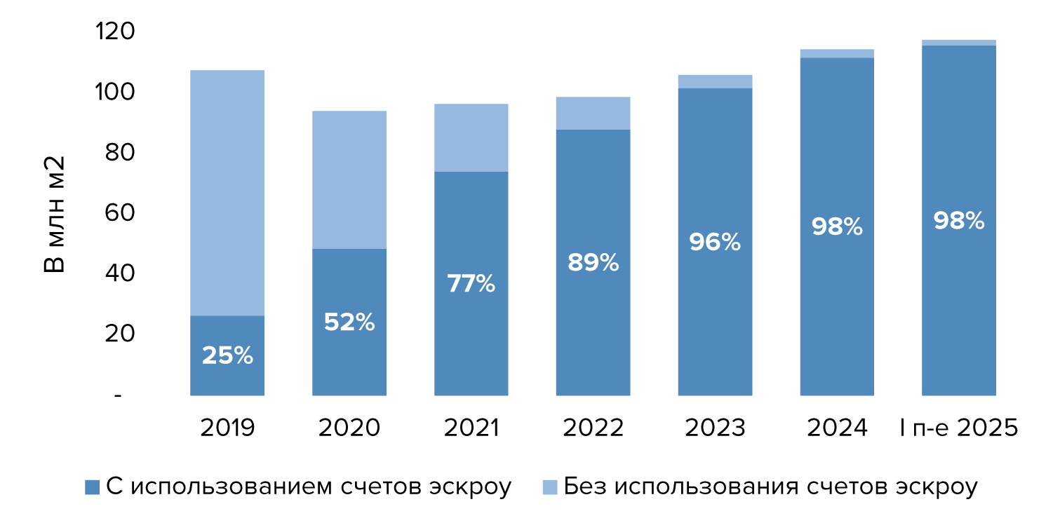 Ключевым драйвером стало массовое внедрение механизма счетов эскроу. После их введения в 2019 году через них финансировалось лишь 25% объектов, сегодня — 98%.