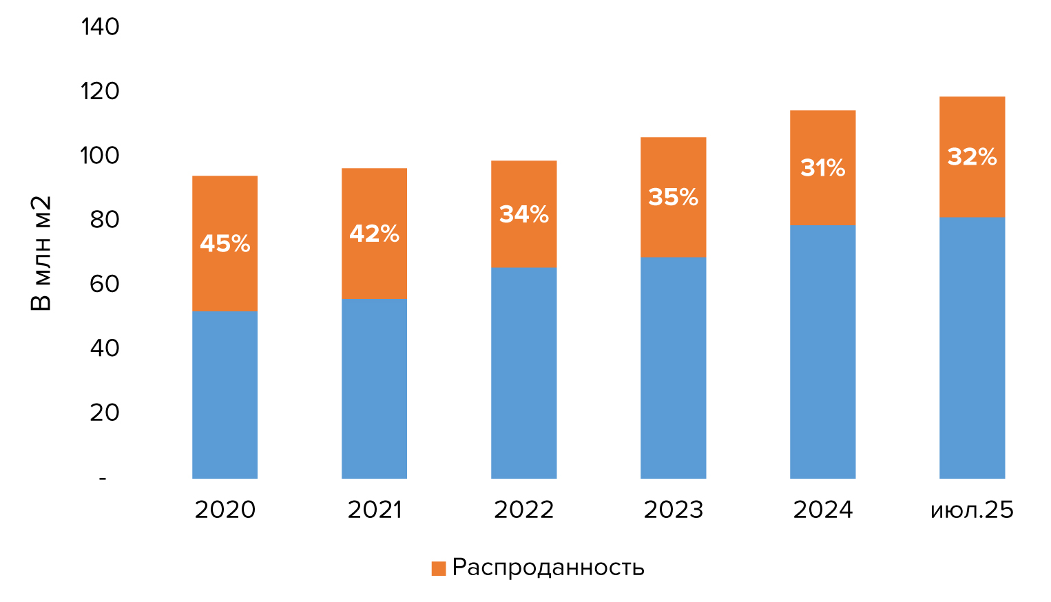При этом распроданность строящегося жилья в 2025-м упала до исторического минимума в 31% — 32%.