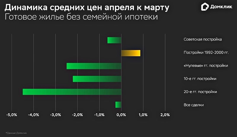 Аналитики Домклик рассмотрели зависимость цен на вторичную недвижимость от «возраста» дома. Они обнаружили, что в апреле произошла резкая краткосрочная «просадка» средней стоимости «квадрата» в объектах, построенных в нулевые, десятые и двадцатые годы (для всех трех групп на 11% — 12%).