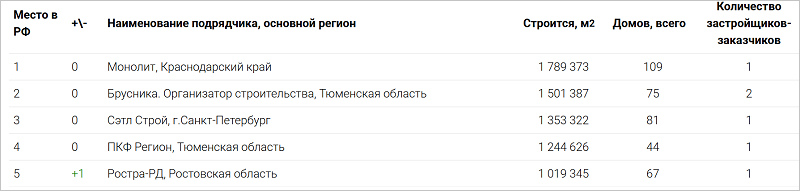 На первой строке рейтинга, как и прежде, генеральный подрядчик «Монолит» (ИНН 2308267988), в текущем строительстве у которого 109 многоквартирных домов общей площадью 1,79 млн кв. м.
