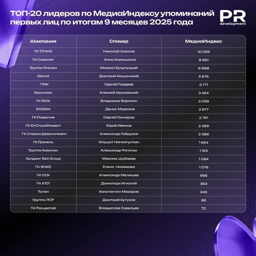 Коммуникационное агентство PR Development выступило инициатором аналитического исследования медийности первых лиц девелоперских компаний. Эксперты определили 20 ведущих федеральных застройщиков по МедиаИндексу* публикаций с упоминанием руководителей компаний в СМИ за 9 месяцев 2025 года. Выборка девелоперов основывалась на масштабах строительства по данным рейтинга ЕРЗ. Федеральными считались игроки, присутствующие более чем в одном регионе России.