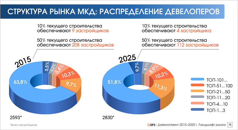 При этом целый ряд регионов теряли свои позиции: Кировская область опустилась на 33 места, Брянская — на 31, Костромская — на 27. В результате рынок стал более концентрированным: рыночная доля, контролируемая крупнейшей сотней девелоперов, выросла с 36% до 48%, а тройка лидеров теперь контролирует 9,7% всего объема против 5,5% десять лет назад.