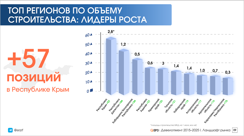География строительства. Если в 2015 году половину объема обеспечивали 7 регионов, то в 2025-м — уже 9. Наибольший рост показала Республика Крым, которая поднялась в рейтинге по объему стройки на 57 позиций. В десятку лидеров вошел Дагестан (+44 позиции), а также Кабардино-Балкарская Республика (+34).