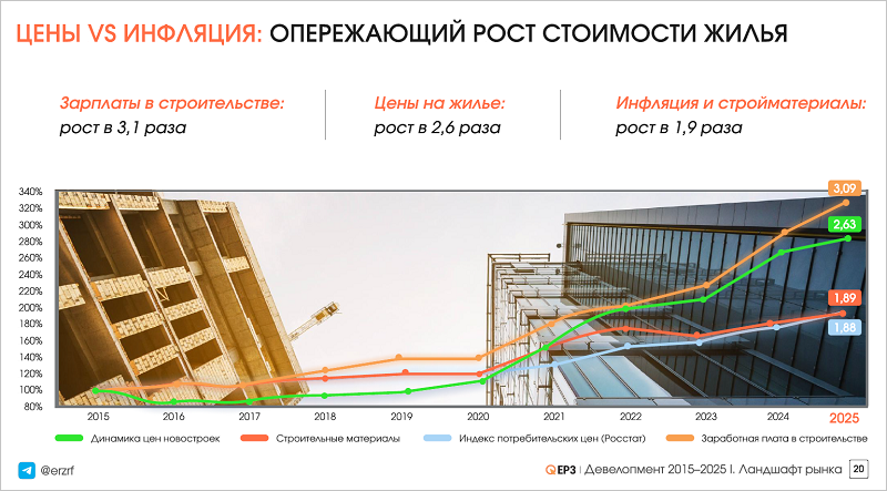 Цены. Стоимость новостроек за десятилетие увеличилась в 2,6 раза, отстав от динамики роста зарплат строителей, но опередив инфляцию и цены на стройматериалы.