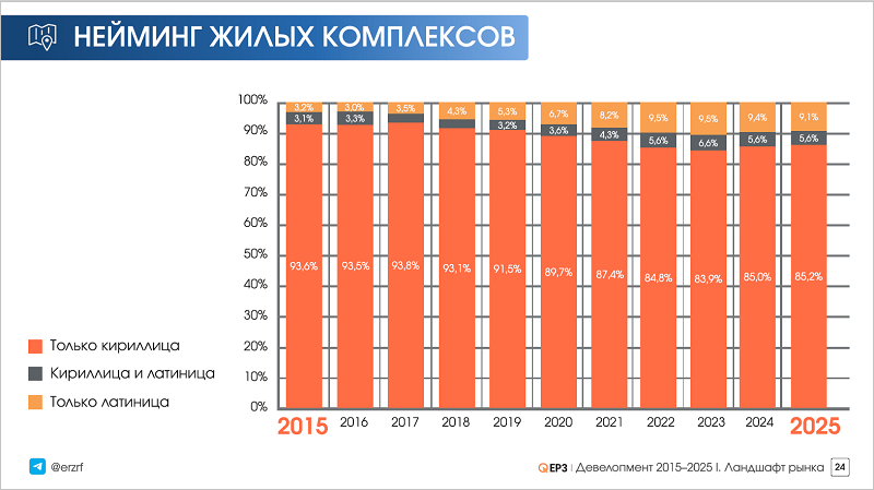 Нейминг. Изменился и язык, которым девелоперы описывают свои проекты. Если в 2015 году преобладали «рощи» и «слободы», то в 2025-м новые ЖК чаще называют «резиденциями» и «садами». Сохраняются устойчивые тренды на использование слов «парк», «квартал», «город». В 2015 году 94% в названиях комплексов использовалась исключительно кириллица, к 2025 году эта доля снизилась до 85%, а использование латиницы выросло почти втрое.