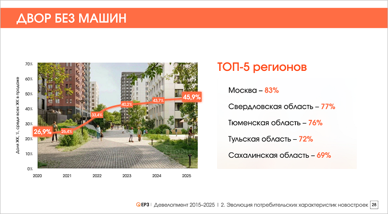 Дворы и благоустройство. Безмашинные дворы сегодня есть почти в 46% проектов по стране, а в Москве их доля составляет 83%. Ландшафтный дизайн присутствует в каждом четвертом комплексе, а в Удмуртской Республике, Москве и Тюменской области — более чем в половине новых ЖК. Все чаще девелоперы закладывают практичные элементы благоустройства: велопарковки (34%), тактильную навигацию (32%) и мощеные пешеходные дорожки (81%).