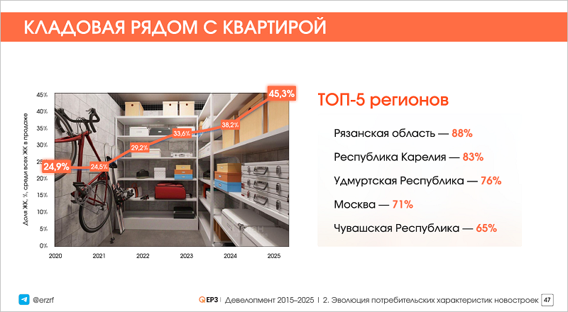 Доступность и комфорт. Подземный паркинг на кнопке лифта стал нормой в крупнейших агломерациях (83% проектов в Москве, 66% — в Санкт-Петербурге). Сквозные подъезды «двор-улица» предусмотрены в 26% новостроек, почти в половине проектов появились кладовые рядом с квартирой.