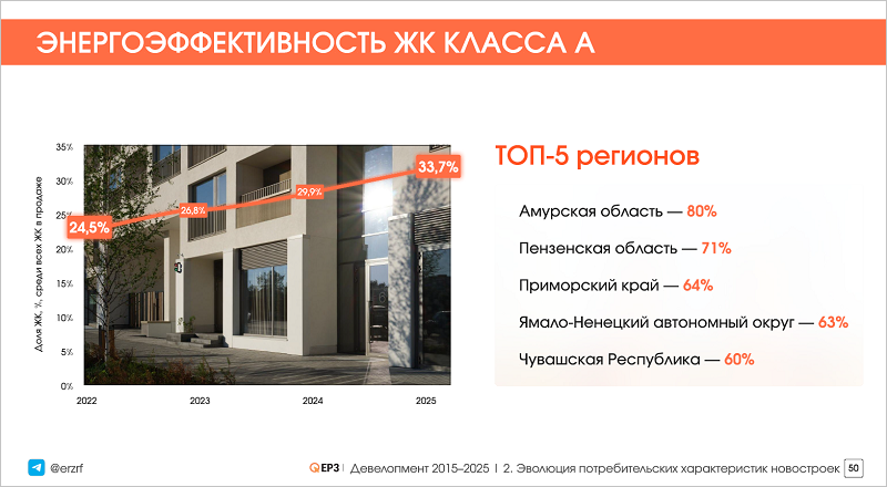 Технологичность. Доля энергоэффективных домов класса «А» выросла до трети рынка, а в ряде регионов превышает 70%. Стандарты премиального жилья — скрытые водостоки, утопленные грязезащитные зоны на входе, широкие двери в лифтах — становятся частью массового сегмента.