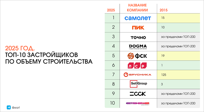 — Тот факт, что за 10 лет в ТОП-10 сохранились только три компании — ПИК, Группа ЛСР и Холдинг Setl Group, — показывает масштаб вызовов, через которые прошла жилищная отрасль. Большинство игроков либо выбыли из числа лидеров, либо вовсе ушли с рынка. Устойчивость этих трех брендов свидетельствует о высоком уровне их системности: от финансовых ресурсов и земельного банка до управленческих решений и маркетинга.