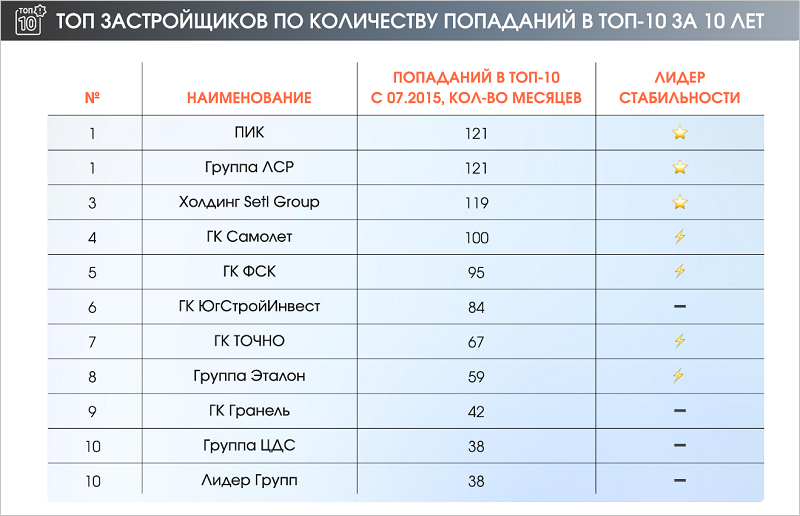 За 10 лет состав десятки крупнейших застройщиков заметно изменился. Одни компании ушли с рынка, другие были поглощены или обанкротились. На их место пришли новые игроки.