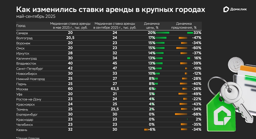 В большинстве рассмотренных городов ставки аренды выросли в среднем на 12%. Наибольший рост арендных ставок зафиксирован в Самаре (+20%, до 24 тыс. руб./мес.), Волгограде (+17%, до 24 тыс. руб./мес.), а также Воронеже и Омске (по +15%, до 23 тыс. руб./мес.).