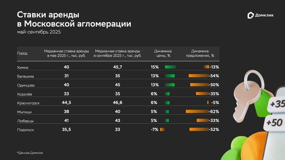 Отдельно эксперты рассмотрели предложение и цены в Московском регионе. С мая по сентябрь 2025 года рынок арендного жилья в городах Подмосковья резко уменьшился при умеренном росте цен.