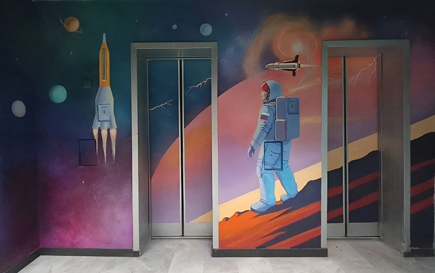 Арт-объект выполнен в космической тематике: на стене у лифтов изображены звезды, планеты и, устремлённая вдаль ракета. Композицию дополняет фигура космонавта. Пространство лифтов здесь становится частью художественной идеи, усиливая не только ощущение движения вверх, но и задавая более глубокую метафору. Поднимаясь с этажа на этаж, человек символически наблюдает за тем, как меняется город: Калуга растёт, обновляется и обретает новый облик благодаря строительству новых жилых комплексов. Проект «Лифт в будущее» реализован совместно с калужскими художниками студии «Искусство_не_десерт» Владимиром Голиком и Ольгой Горюновой.