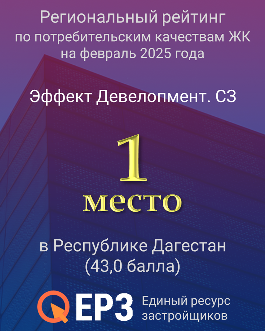 Портал ЕРЗ.РФ опубликовал рейтинги потребительских качеств жилых комплексов и застройщиков России. По состоянию на февраль 2025 года, в Республике Дагестан первое место занял ЖК «Гранатовый» от EFFECT development.