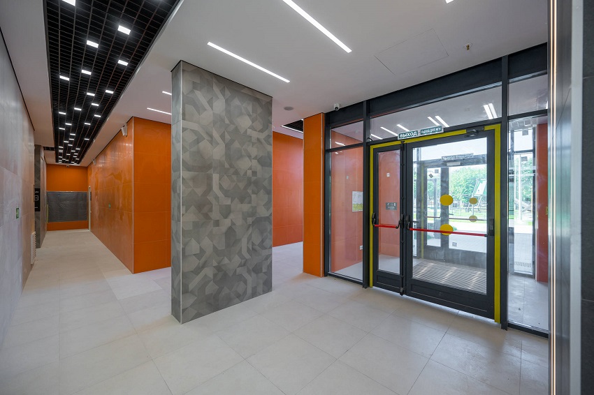 На первых этажах корпусов жителей ждут просторные лобби с панорамными окнами и ярким интерьером, эффектно сочетающим насыщенные оранжевые оттенки с темно-графитовыми и нейтрально-серыми элементами. В ближайшее время, по мере передачи комплекса управляющей компании и выдачи ключей от квартир жителям, в лобби обустроят мягкие зоны для отдыха. Помимо этого, здесь также оборудованы комнаты матери и ребенка, а также комнаты для хранения детских колясок и велосипедов.