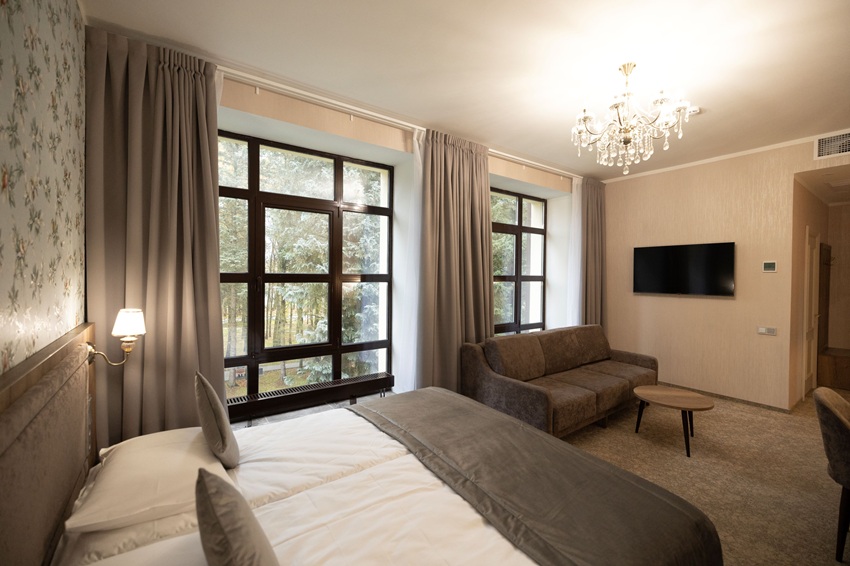 Сегодня гостиничный корпус «Усадьба» площадью 6,3 тыс. кв. м готов принять своих первых гостей. Всего здесь запроектировано 82 гостиничных номера различного уровня комфортности и вместимости. На выбор представлено порядка десяти категорий номеров, включая номера с балконами и панорамными окнами. При этом за счет расположения корпуса в центральной части территории курорта в окружении многолетних хвойных деревьев из окон номеров открывается живописный вид. Общая вместимость номерного фонда составляет 240 человек.