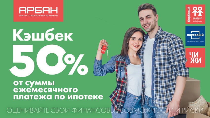25 февраля 2025 г. Группа строительных компаний «Арбан» запускает программу «Ипотека с кешбэком», в рамках которой застройщик компенсирует своим покупателям 50% от суммы ежемесячного платежа. Приобрести квартиру по данной программе можно в одном из трех строящихся объектов застройщика со сдачей в 2025 году: семейном квартале БАРБАРИС, высотном микрорайоне ЧИЖИ и лофт-районе ПОРТОВЫЙ.