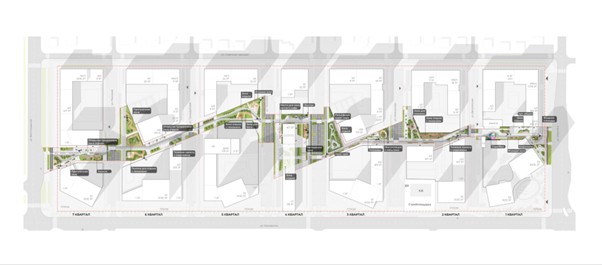 Застройщик и его первый проект заходят на территорию, где на семь кварталов приходится работа шести застройщиков под эгидой масштабного редевелопмента района. Обычно это ведёт к неминуемой конкуренции и маркетинговой бойне, но здесь девелоперы договорились о единой пешеходной аллее, пространстве для жителей района, которое связывает между собой всю площадь застройки, и о сотрудничестве. Так застройщики сделали ставку на эффект синергии и привлечение большего внимания к локации. Однако конкуренция никуда не делась.