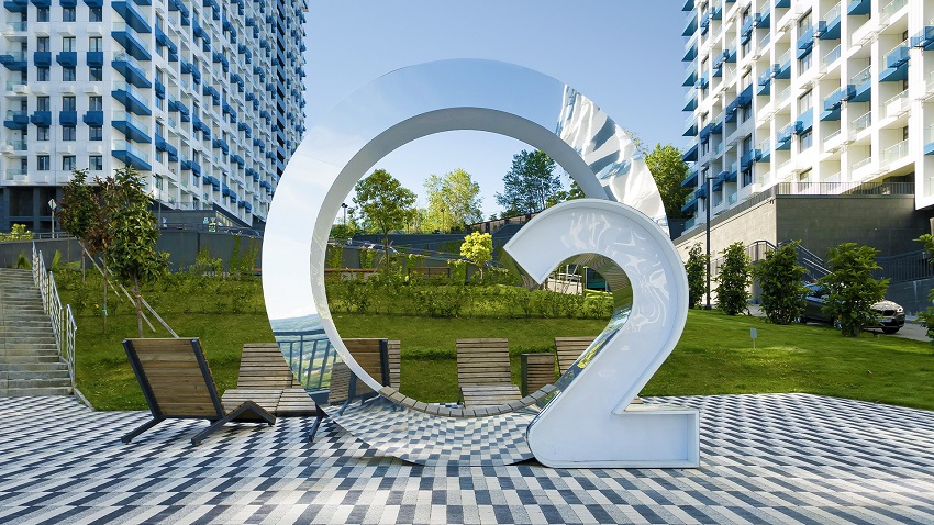 Название жилого комплекса отражается в концепции проекта. Во дворах установлены фотозона и водный арт-объект в форме, повторяющей плавные линии химического элемента Кислорода O2. Более 22 000 квадратных метров внутренней территории занимают зеленые зоны с южными растениями и цветами. Они не только украшают ландшафт, но и выполняют практическую функцию: создают тень, защищают от ветра и дополнительно насыщают воздух кислородом.