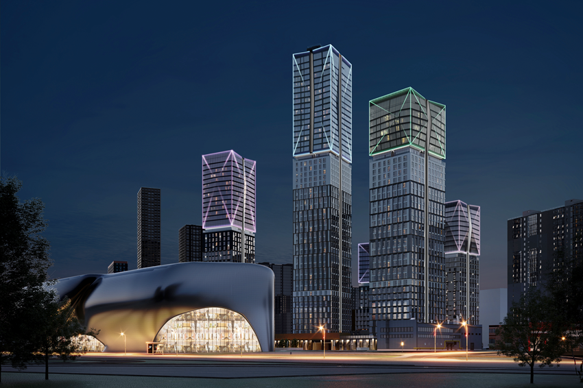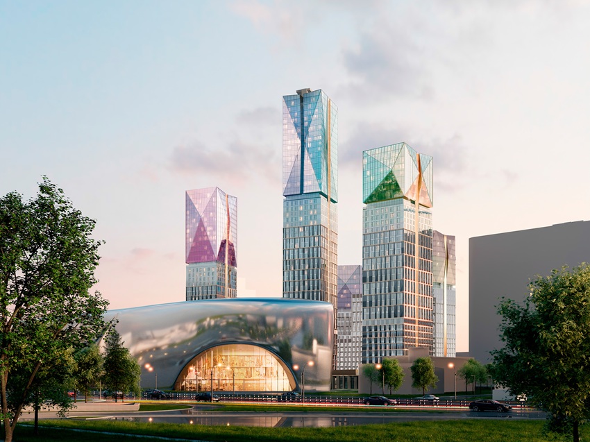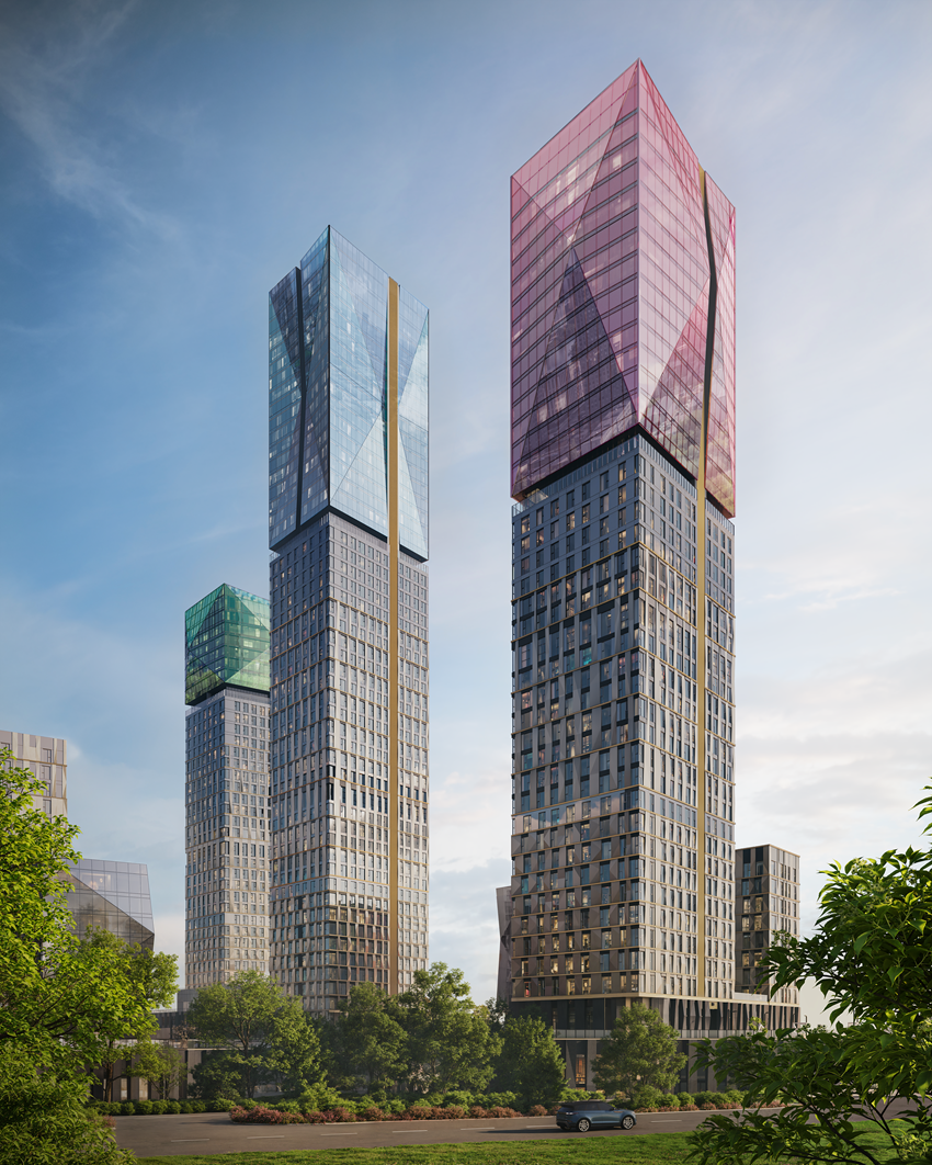 На Карамышевской набережной в районе Хорошево-Мневники появится новая архитектурная доминанта в стиле emo-tech. Образ зданий раскрывается через идейную метафору сияющего у воды природного кристалла. Верхний ярус высотных доминант выполнен в форме многогранных наверший из стекла, у каждого — оригинальная форма и цвет. В основном объеме фасада панорамные окна дополнит рельефный камень. Акцентом зрительной организации по вертикали выступает пояс из металла. Вечерний образ комплекса дополнит архитектурная подсветка с деликатным мерцанием по вертикали и цветовым оформлением наверший.