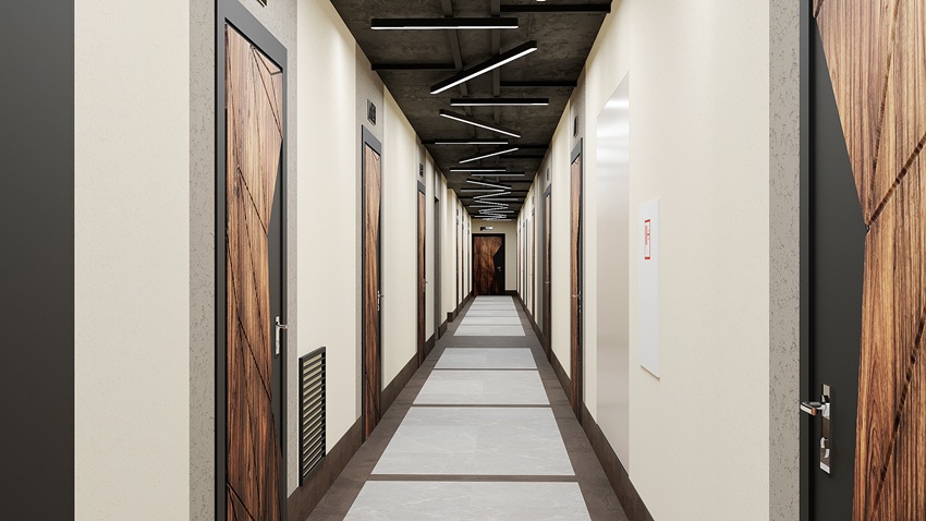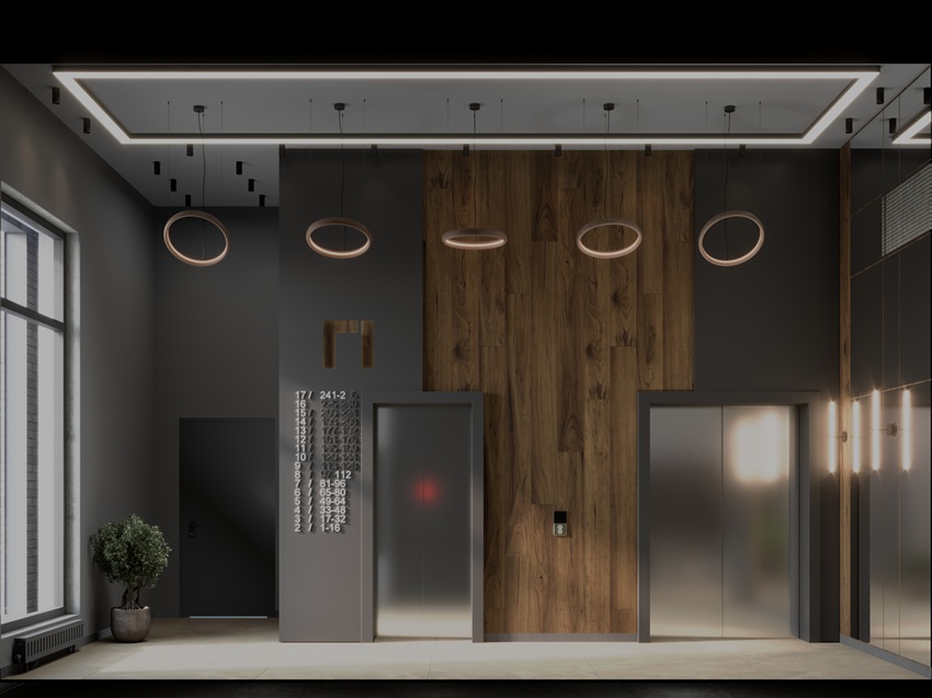В отделке мест общего пользования на первых этажах использованы натуральные и вандалоустойчивые материалы: керамогранит, декоративная штукатурка, композитные панели «под рейку» графитового цвета на потолках. Приятную атмосферу создаст многоуровневая система освещения. Сценарий включает три типа света: заливающий — для комфорта, театральный — для акцентов, и декоративные круглые лампы — для создания камерной атмосферы.