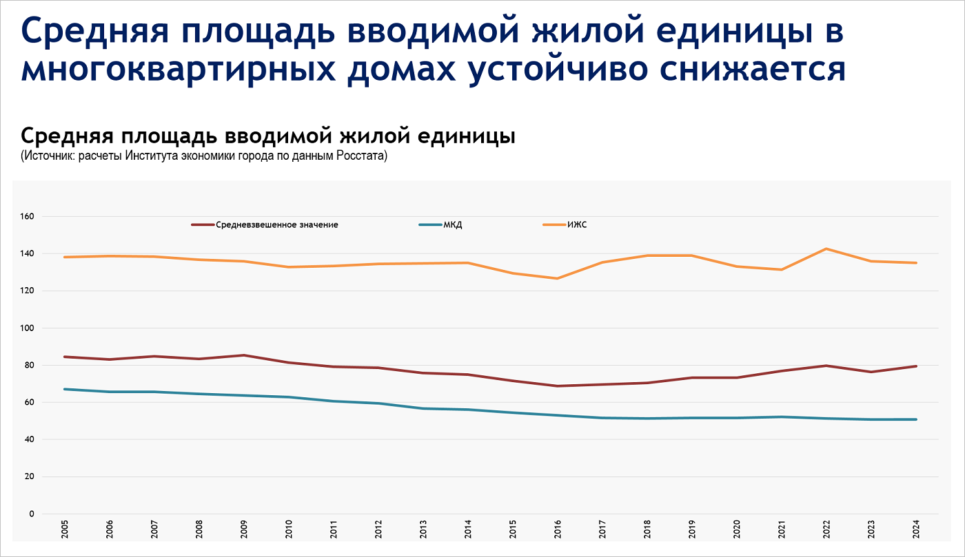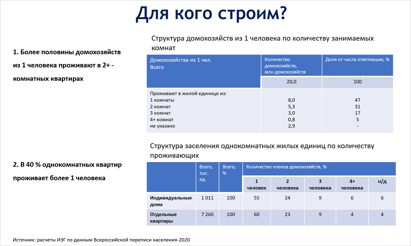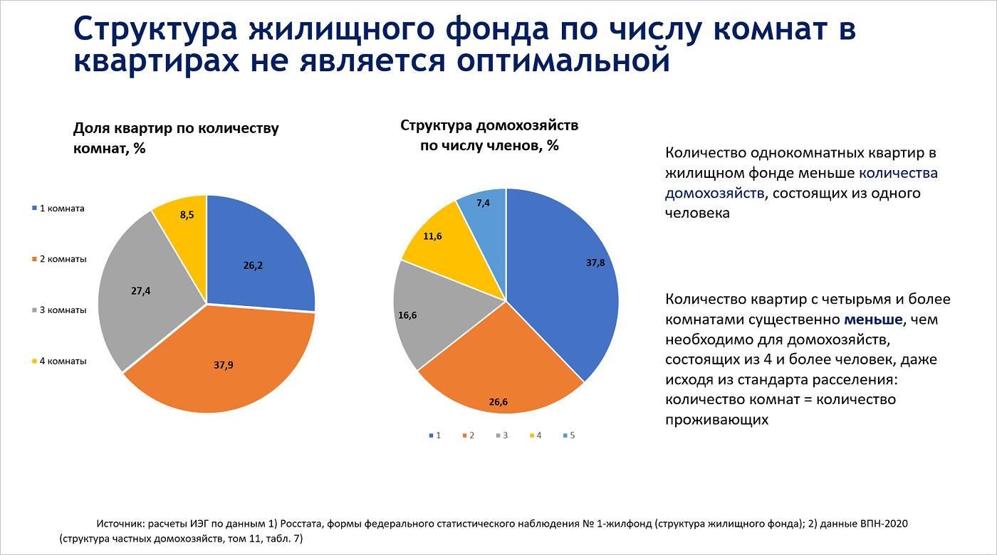 По его словам, за межпереписной период 2010—2021 годов доля домохозяйств, состоящих из одного человека, выросла с 26% до 38% — 40%. При этом структура жилищного фонда меняется медленнее, чем структура спроса, что формирует перекосы.