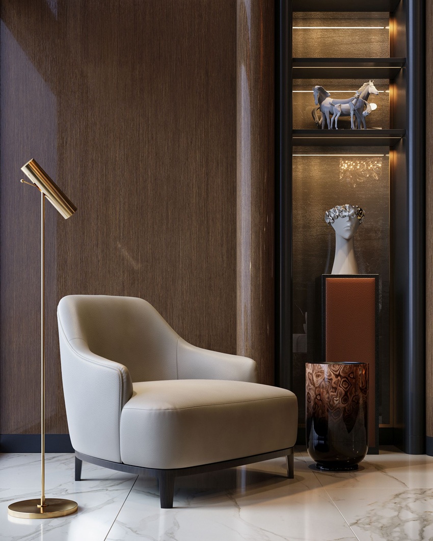 Темно-коричневый шпон из благородных пород дерева в сочетании с черным мрамором Nero Marquina создает атмосферу роскоши. Бронзовые арт-объекты и латунные световые инсталляции перекликаются с логотипом жилого квартала «Прайм Парк», украшающим настенную панель с интегрированной подсветкой. Для полов предусмотрен белоснежный керамогранит с зеркальным эффектом, имитирующий бесконечную мраморную гладь.