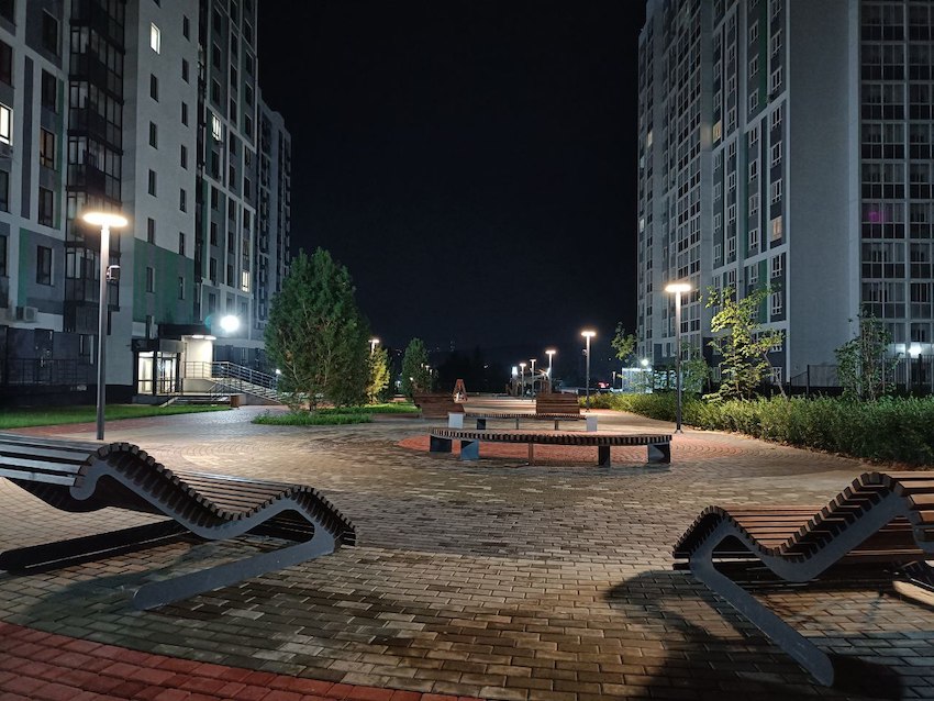 В жилом комплексе успешно реализована концепция «безопасный двор» или «двор без машин» — исключен вход посторонних и проезд автотранспорта на внутреннюю дворовую территорию (кроме автомобилей специальных служб). Для удобства все дома ЖК со сквозными подъездами, в которых два входа: один на закрытый двор, второй — к подъездной дороге и парковке. Закрытая территория группы домов представляет собой прогулочную аллею с лавочками и шезлонгами, детскую игровую зону с мягким резиновым покрытием, беседки с большими песочницами, озеленение хвойными и лиственными породами деревьев и кустарников.