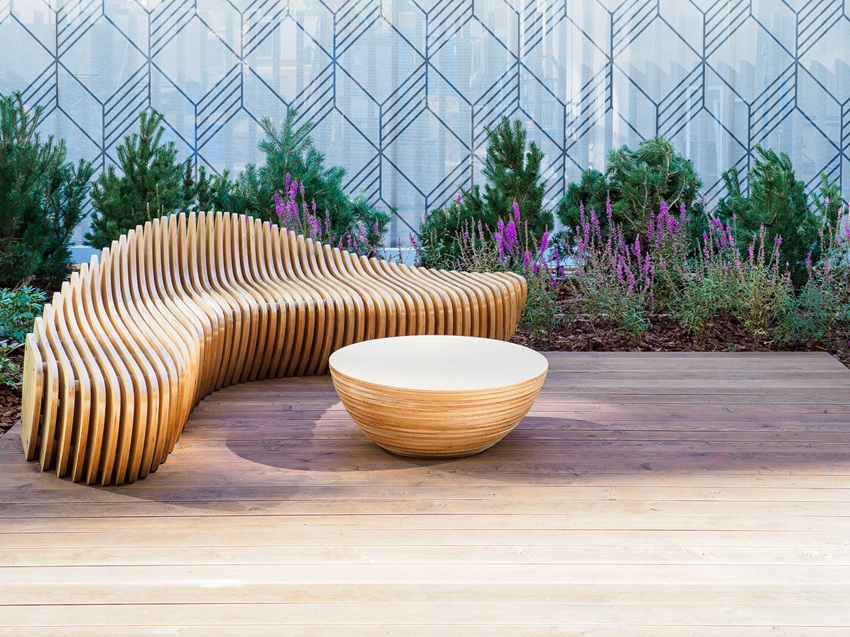 Ландшафтная концепция территории обыгрывает тему альпийского высокогорья с характерным сочетанием природных материалов – камня и дерева, дополненных тщательно продуманной растительной палитрой. Пространство организовано как серия открытых общественных гостиных, разделенных декоративными кустарниками и соснами в массивных вазонах. Эти зеленые «комнаты» оборудованы параметрической мебелью из высококачественной влагостойкой древесины, обработанной специальными пропитками для долговечности.