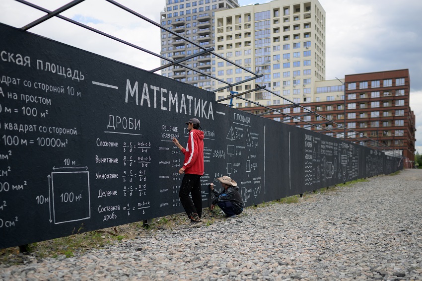 500 метров длиной, 400 квадратных метров площадью — строительный забор вдоль школы на Евробереге собрал основные правила, формулы и факты из школьной программы. Пока идешь вдоль забора — невольно вспомнишь, где писать «-ться», а где «-тся», сколько часовых поясов в России и как вычислить площадь треугольника. Чтобы написать все формулы и правила на заборе, потребовалась неделя работы, круглосуточная работа бригады художников и 50 литров белой краски.