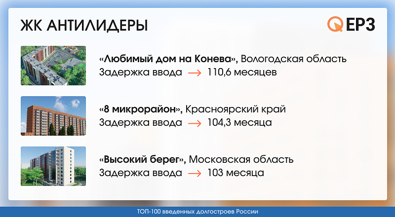 В двадцатку антирейтинга новостроек вошли введенные в 2025 году проекты из 15 регионов. Среди них — Московская, Ленинградская, Калининградская, Ростовская и Нижегородская области, а также Краснодарский край и Республика Дагестан. Длительность переносов варьируется от 49 до 110 месяцев.