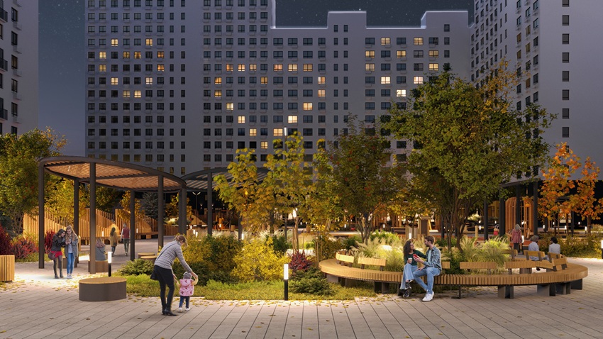 Планируется установить несколько малых архитектурных форм, которые улучшат общий вид всего района. А продуманная схема освещения всей прогулочной зоны поможет создавать прекрасную атмосферу в вечернее время. Также будут оборудованы дополнительные парковочные места для удобства жителей и гостей жилого комплекса.