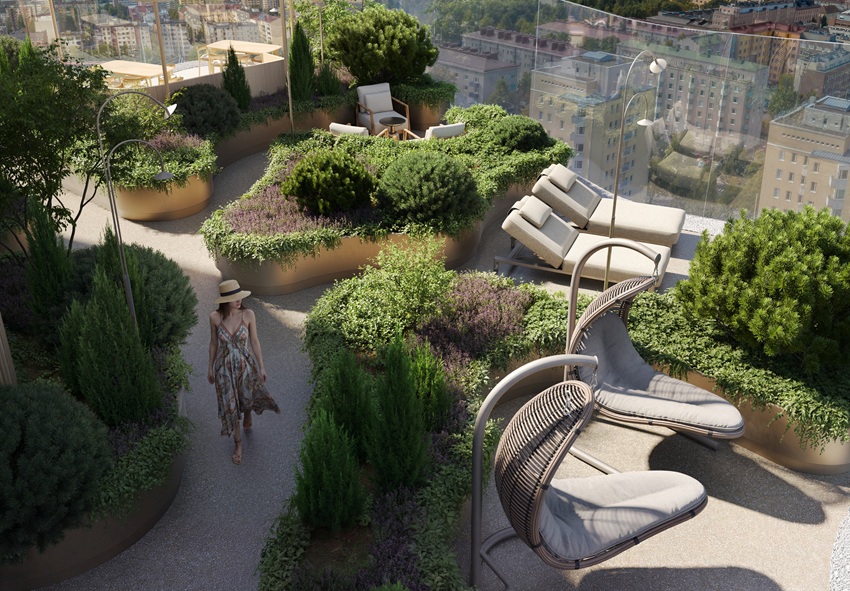 Визуальную узнаваемость будущему дому придаст парящий мост-сад, соединяющий корпуса “Энигмии”. На нем будет сформирована всесезонная общественная территория для всех жителей дома. Здесь откроются детские площадки, место для занятий йогой и другие зоны отдыха. Переосмыслив таким образом традиционный двор, архитекторы создали уникальное приватное пространство, защищенное высокими панорамными стеклами и наполненные естественным светом. В свою очередь, плавные и выразительные формы сооружения акцентируют внимание на здании и подчеркивают его спокойные скульптурные силуэты.