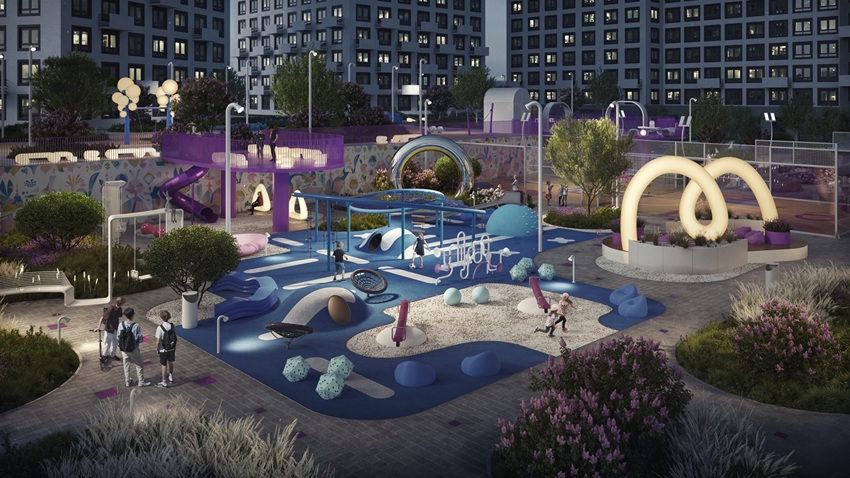 На первых этажах разместятся общественные зоны, включая комьюнити-центр «Сценариум», библиотеку, коворкинг, кинозону и детскую игровую территорию «Игрополис». Во дворе появятся прогулочные аллеи, зоны отдыха, амфитеатр, арт-объект «Световая спираль» и смотровые площадки. Для удобства жителей предусмотрен подземный паркинг с кладовыми.