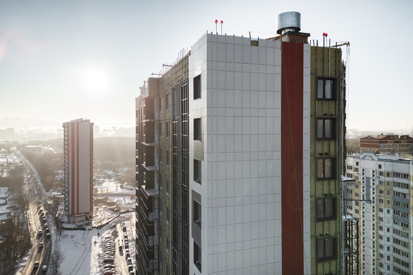 - Продолжается монтаж вентилируемого фасада - в корпусе №1 работы выполнены на уровне 62%, а в корпусе №2 на 50%.