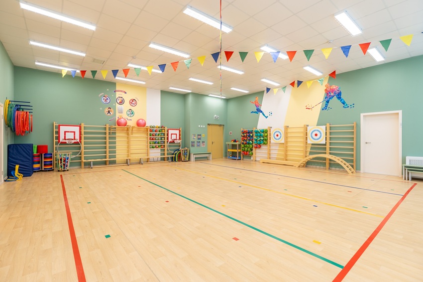 В здании предусмотрены игровые комнаты, спальни, раздевалки и санитарные блоки, а также кухня полного цикла. Для занятий физкультурой оборудованы спортивный зал и бассейн, для творческого развития — музыкальный зал и кабинеты для кружковых занятий. На прилегающей территории обустроены игровые площадки, в том числе зоны для гимнастики и занятий физкультурой на свежем воздухе.