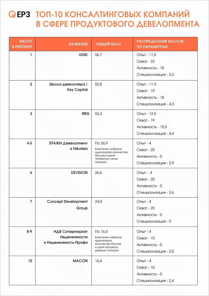 Реестр консалтинговых компаний в сфере продуктового девелопмента составлен специалистами ЕРЗ.РФ на основе комплексной оценки опыта, проектного и географического охвата, профессиональной активности и специализации компаний. В реестр вошли только те консультанты, которые реально работают с девелоперами над созданием концепций жилых проектов и в сфере управления продуктовой стратегией.