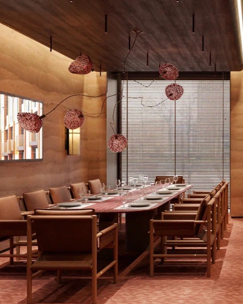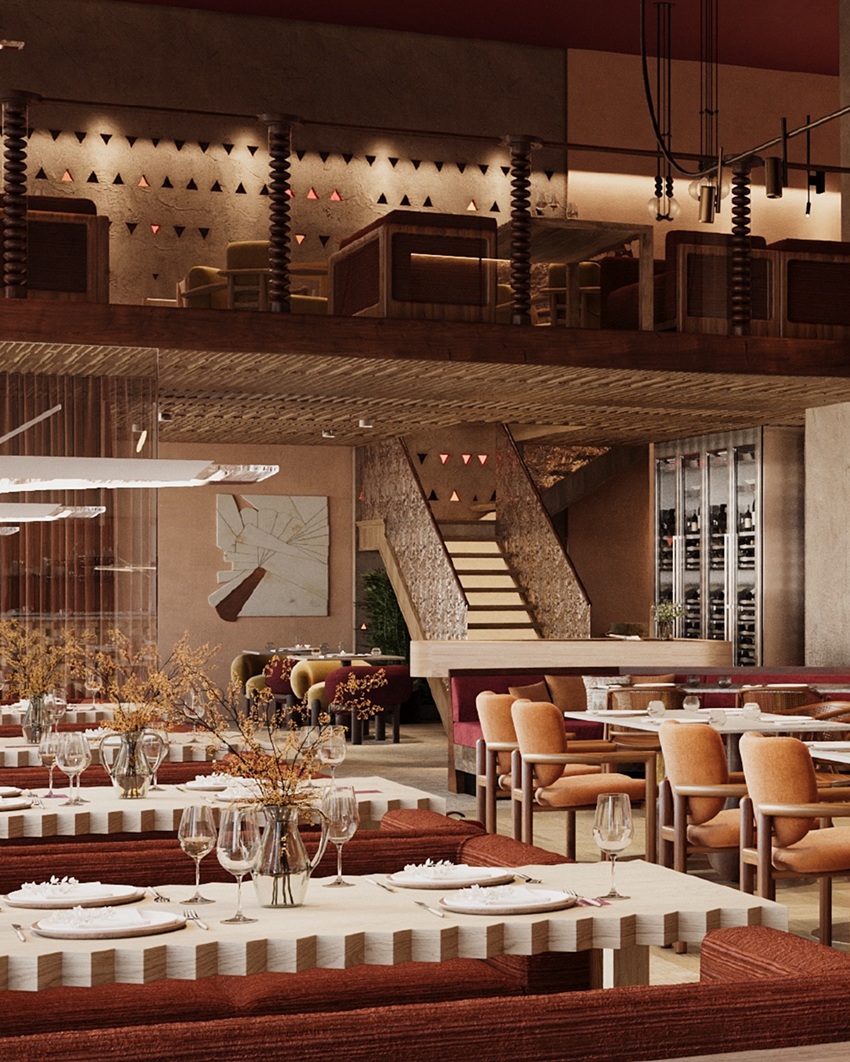 Интерьер «Grand Урюк» разработан дизайнером Александрой Винер Viner Design Group. Пространство построено на сочетании натуральных материалов, мягкого света и спокойной архитектуры, которая не давит, а скорее обволакивает. Здесь много дерева, природного камня и тактильных фактур - деталей, которые создают ощущение тепла и внутреннего равновесия. Восток в этом интерьере присутствует не буквально, а скорее на уровне настроения: вместо прямых декоративных цитат - тонкое современное прочтение традиций. Восточные мотивы звучат приглушенно, как отдаленное воспоминание о доме, о корнях и о простой, настоящей жизни. Панно из натуральной хлопковой ткани становятся визуальными акцентами пространства и добавляют интерьеру глубины.