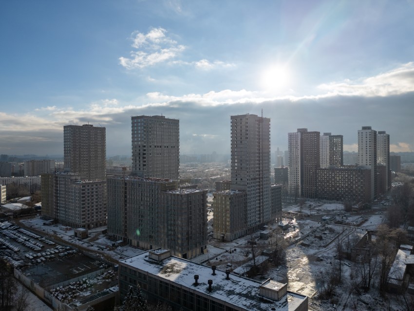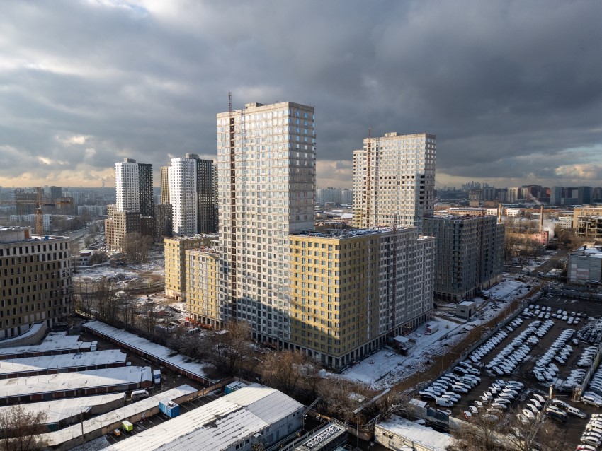 В настоящий момент застройщик полностью завершил возведение монолитного конструктива и приступил к монтажу модульных фасадов. Ранее на площадке был демонтирован башенный кран. Во всех корпусах выполнена каменная кладка наружных стен и продолжается остекление.
