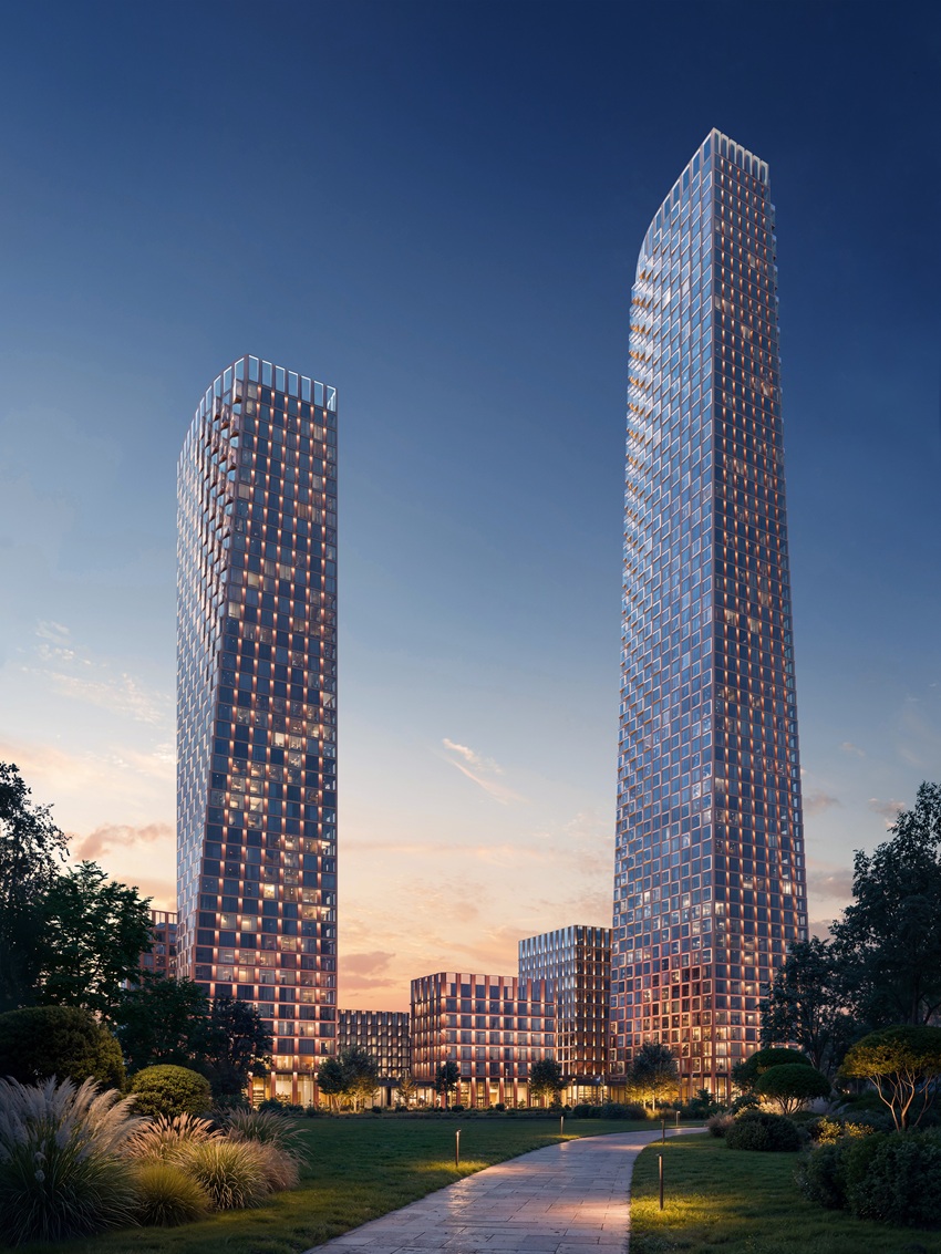 В архитектурной концепции реализована серия новаторских приемов: оригинальная форма зданий со смещением объема по спирали, выступающие за фасады горизонтальные и угловые окна, комбинация металла, камня и стекла. В вечернее время рельеф дополнит деликатная архитектурная подсветка.