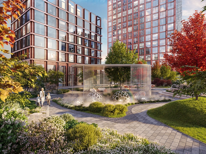 Концепция благоустройства территории разработана совместно с архитектурным бюро Wowhaus для приватного двора и внешнего периметра домов в составе городских прогулочных маршрутов. Пространство будет организовано с учётом естественного перепада высот до трёх метров и встроенных в рельеф зон отдыха. Проектом предусмотрены уличный коворкинг, игровые комплексы для разных возрастов детей, зеленая гостиная с очагом, интерактивные паровые гейзеры.