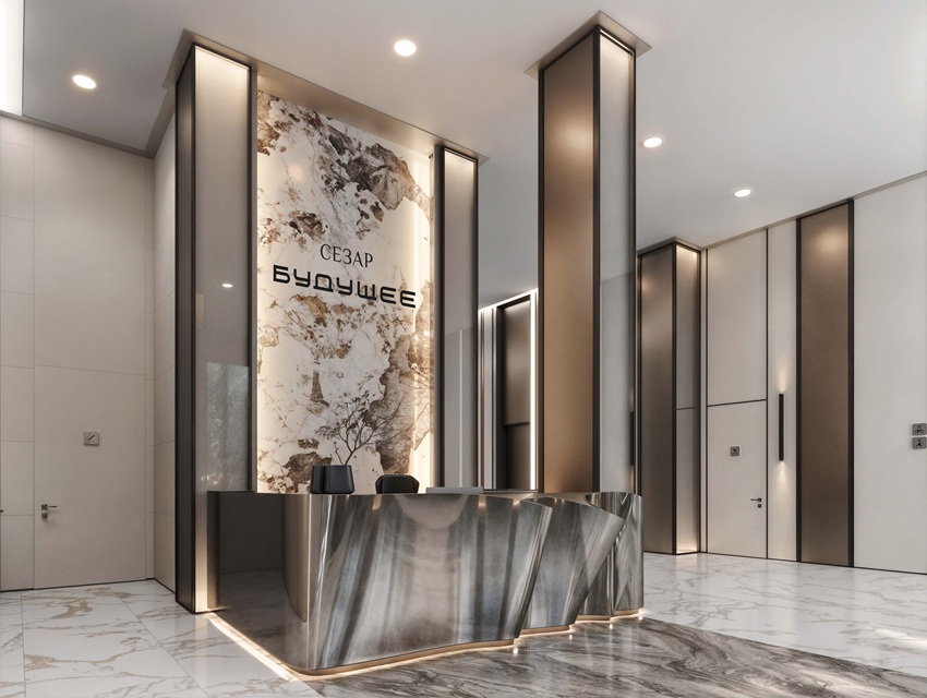 Заданную внешнюю архитектурную концепцию продолжат интерьеры входных групп. Для каждого из типов зданий предусмотрен свой дизайн-проект. Три авторских дизайна интерьеров объединит единая концепция «Взгляд в будущее» с использованием в отделке слэбов, тонированного стекла, металла, арт-объектов. Интерьеры разработаны студией дизайна и архитектуры Nobbey.