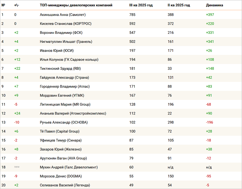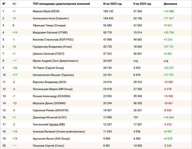 Среди новичков рейтинга — Андрей Мухин (Галс-Девелопмент) и Сергей Пахомов (Группа Голос). Наибольший прорыв показали Павел Тё (Capital Group), поднявшийся на 26 позиций за квартал, и Ильшат Нигматуллин (ГК Гранель), улучшивший результат сразу на 17 строк.