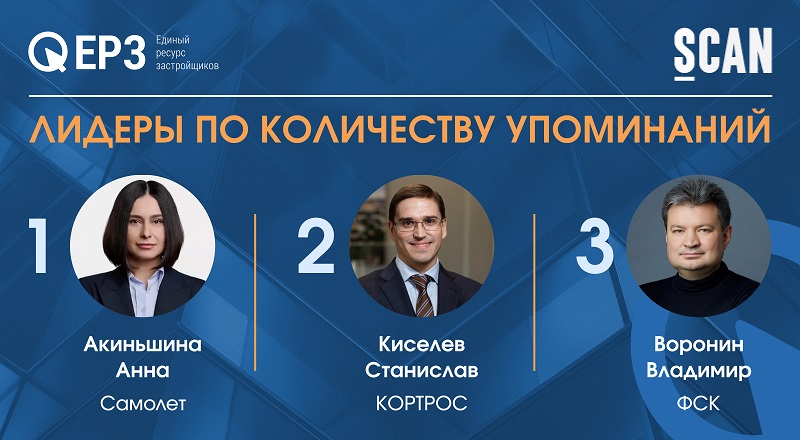 На втором месте удержался Станислав Киселев (ГК КОРТРОС) с 592 упоминаниями (+220 за квартал), на третьем — Владимир Воронин (ГК ФСК), который стал выше на две позиции и увеличил показатель до 547 публикаций (+331).