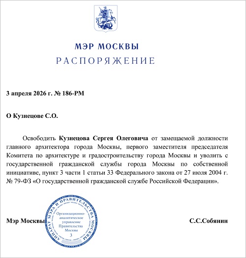 Согласно тексту указа, увольнение главного архитектора произошло «по собственной инициативе».