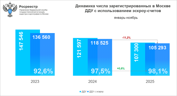 В январе — ноябре 2025 года в Управлении Росреестра по Москве зарегистрировано 105 293 договора участия в долевом строительстве (ДДУ) на рынке жилой и нежилой недвижимости с использованием счетов эскроу, сообщила пресс-служба столичного регистрационного ведомства.