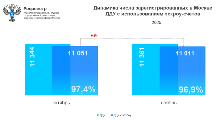 При этом доля ДДУ с эскроу от общего числа зарегистрированных первичных договоров за ноябрь в столице (11 361 ДДУ) составила 96,9%.