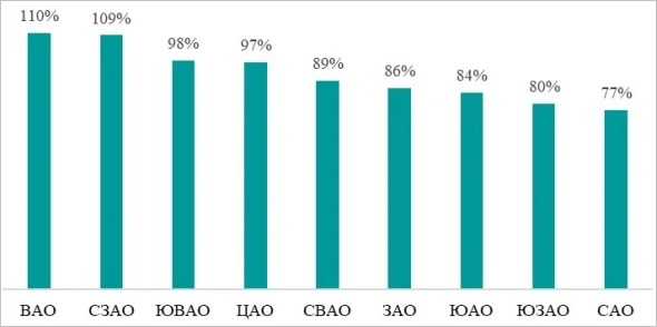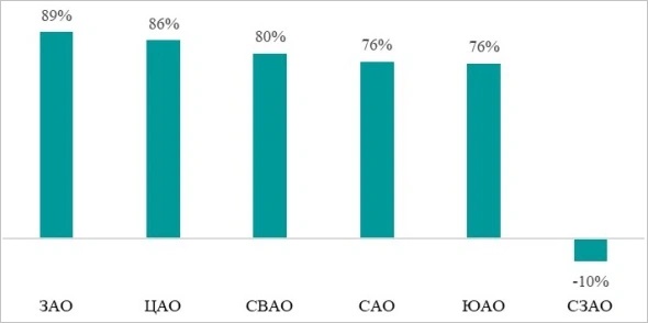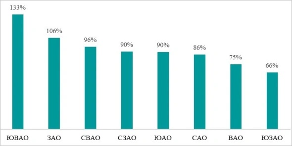 На второй позиции — Северо-Западный округ (+109%, в 2,09 раза), до 535,8 тыс. руб., третье место занял Юго-Восточный округ (+98%), до 461,3 тыс. руб. за 1 кв. м.