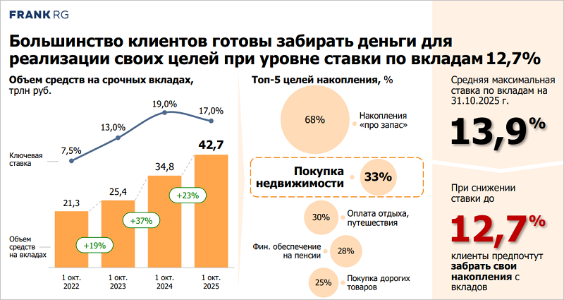 Согласно опросу Frank RG, только 13% его участников планируют покупку жилья в 2025 году, а 87% отложили ее на два-три года и более из-за высоких ставок и цен на жилье.